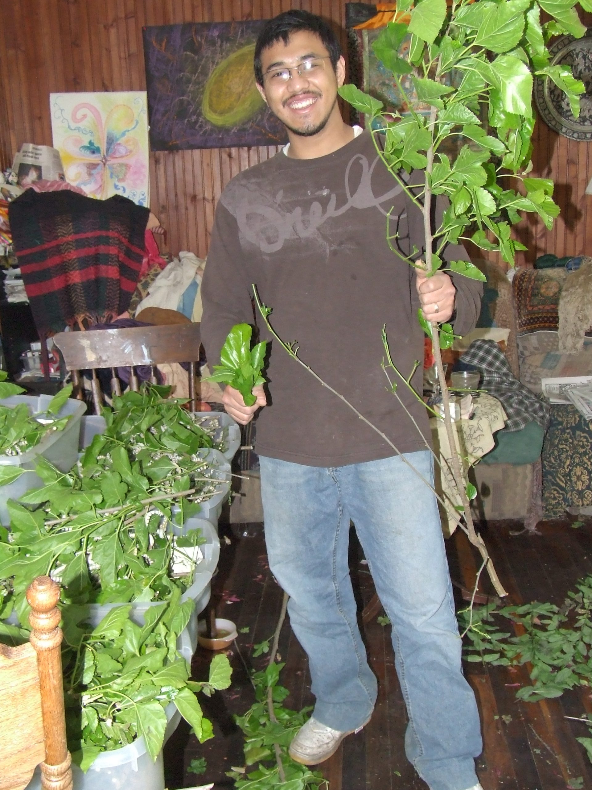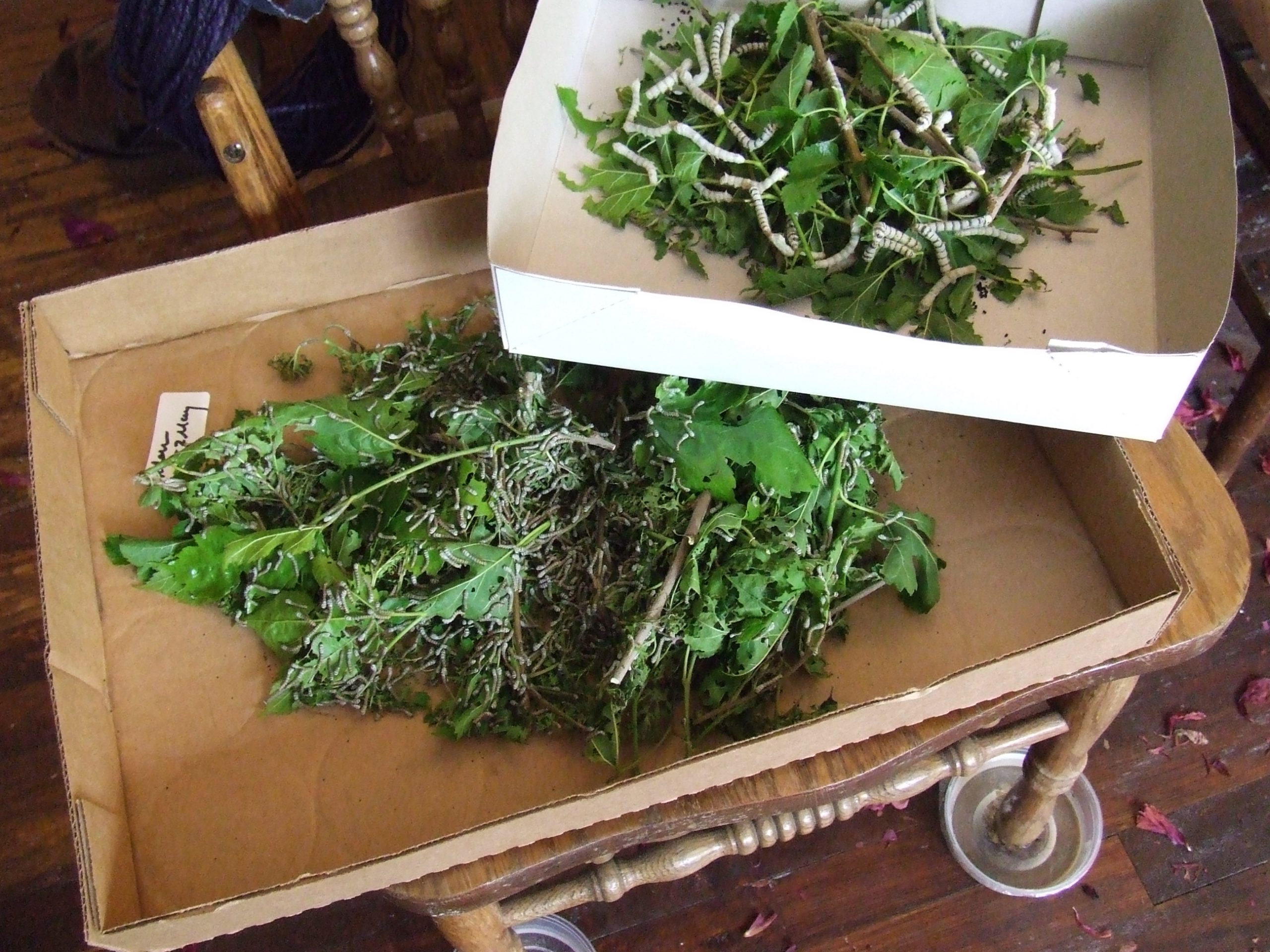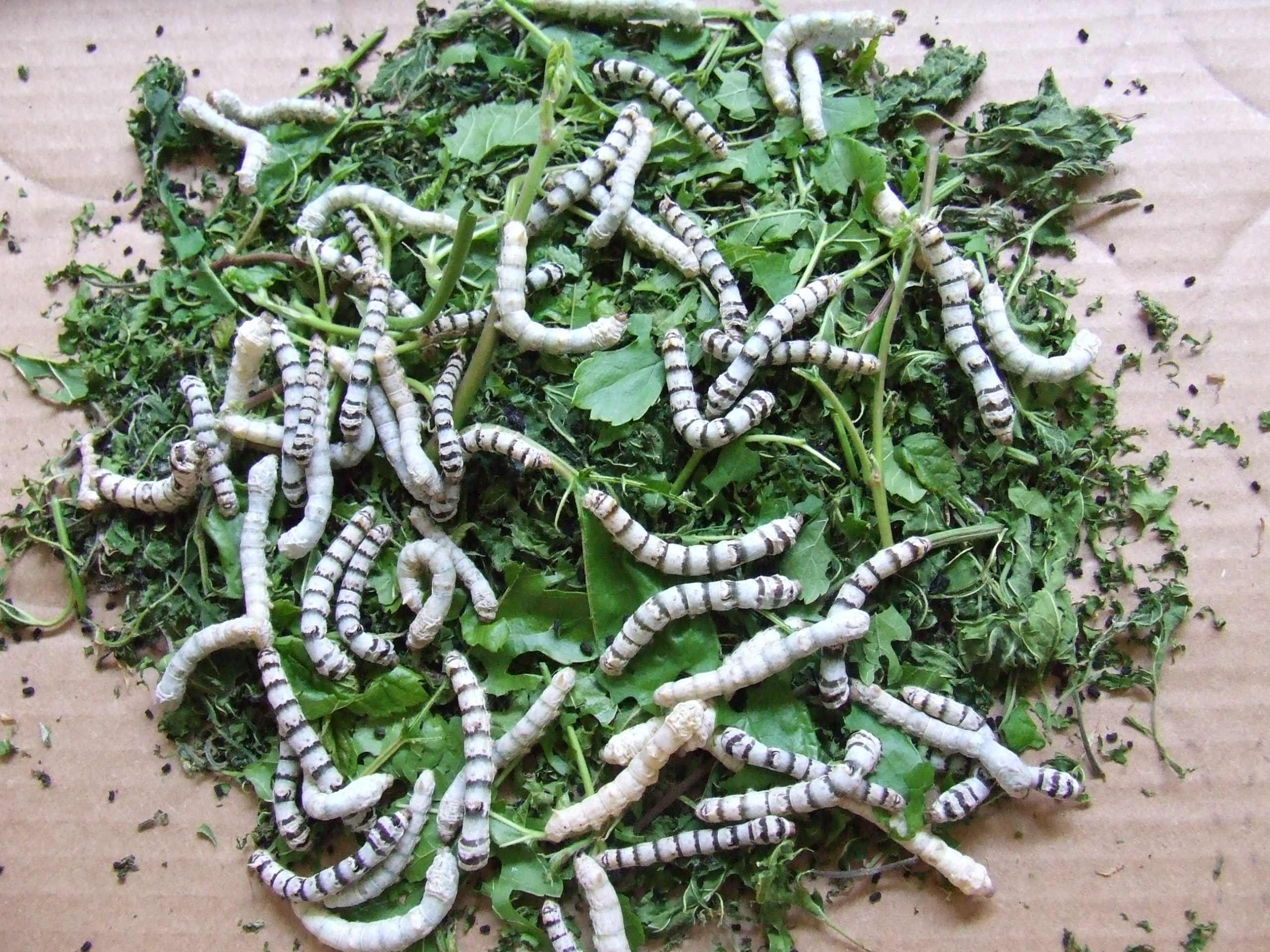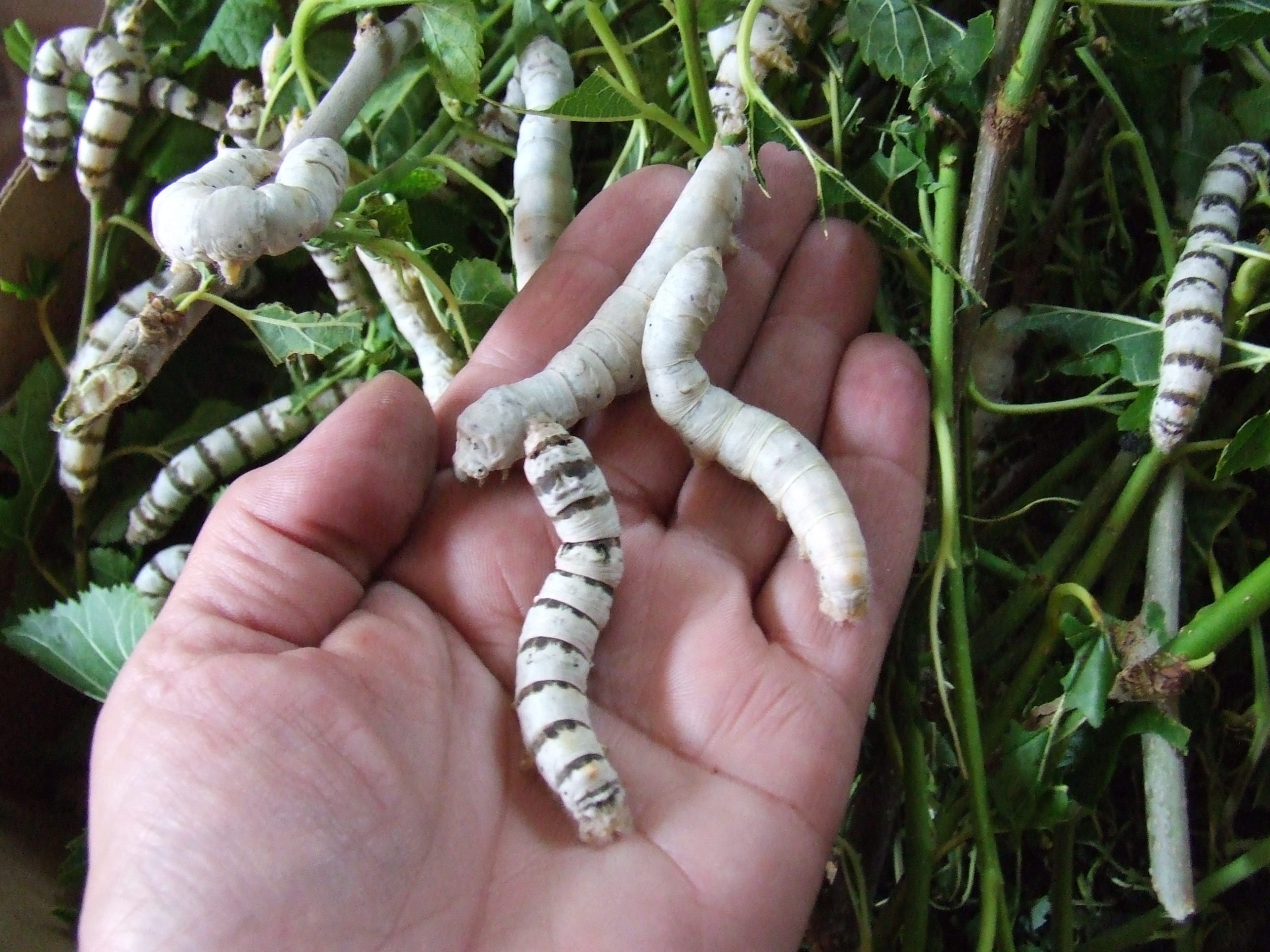 Keep feeding the finest leaves that you have, until the worms are at least an inch long and can chew on larger leaves. In the final stage, when the caterpillar grows from a bit over 1” to almost 4” or more in 10 days, they can eat the big mature leaves. They will eat their most in this last phase; it is an abundance of these leaves that will produce the most silk.