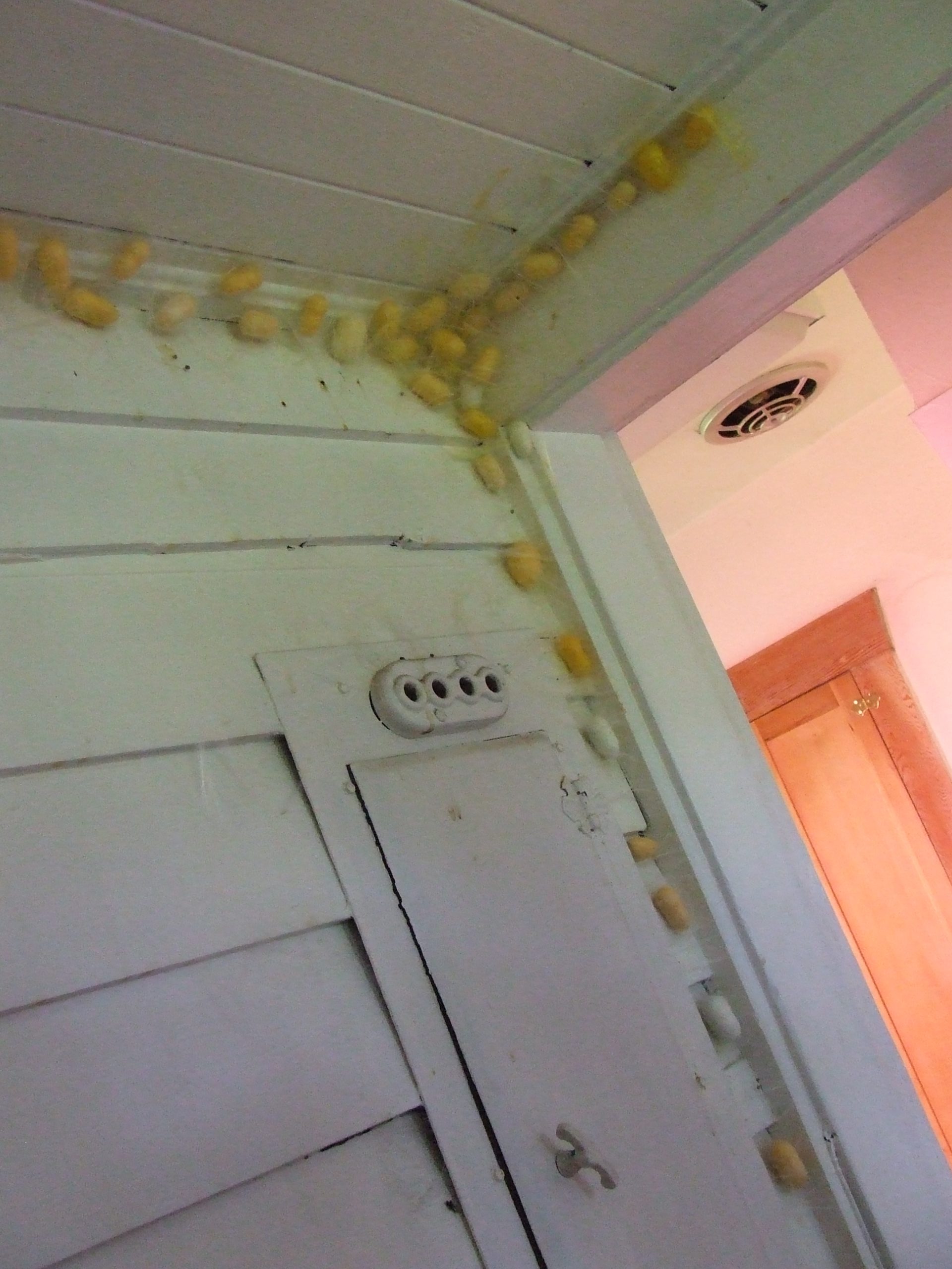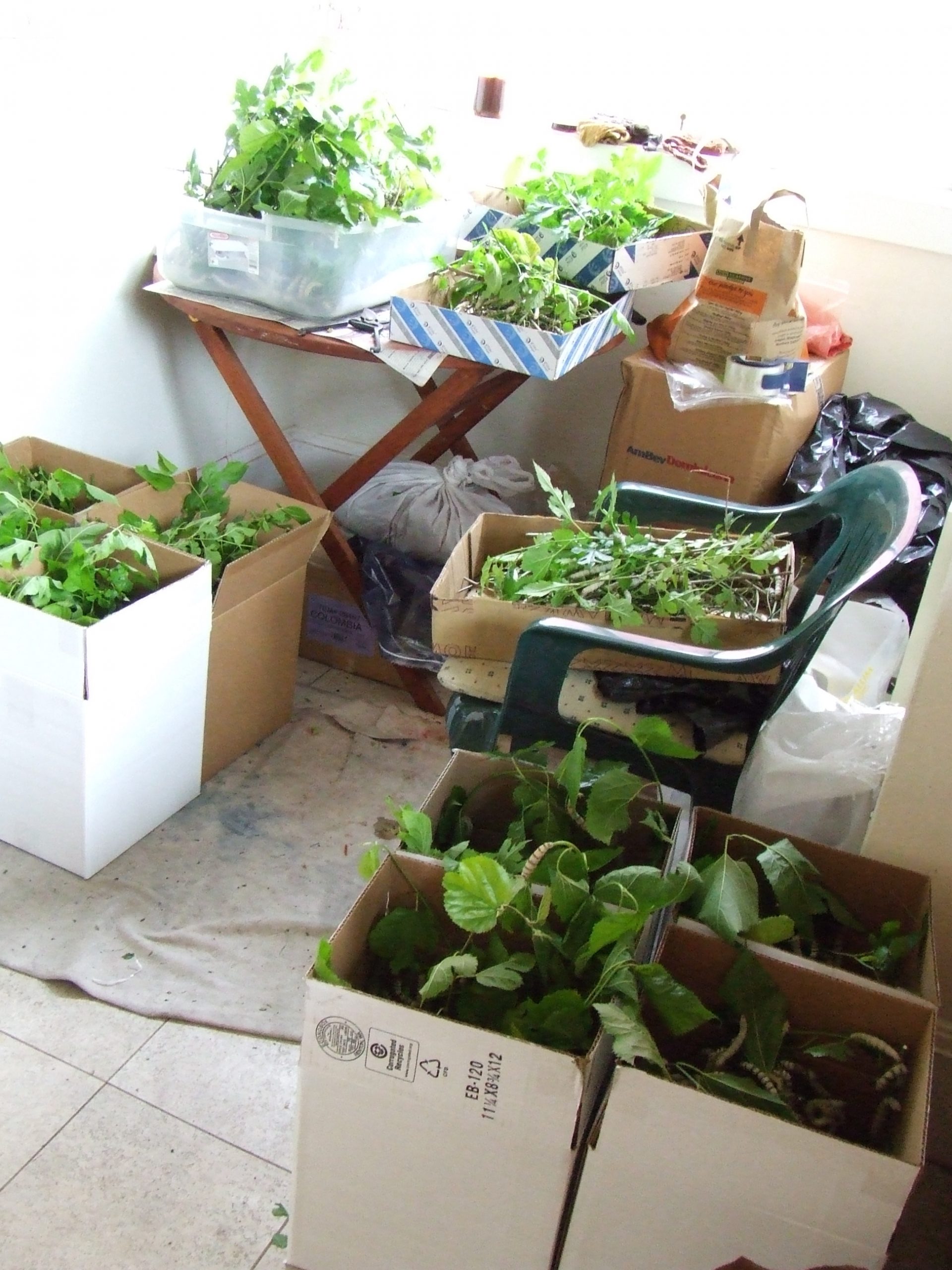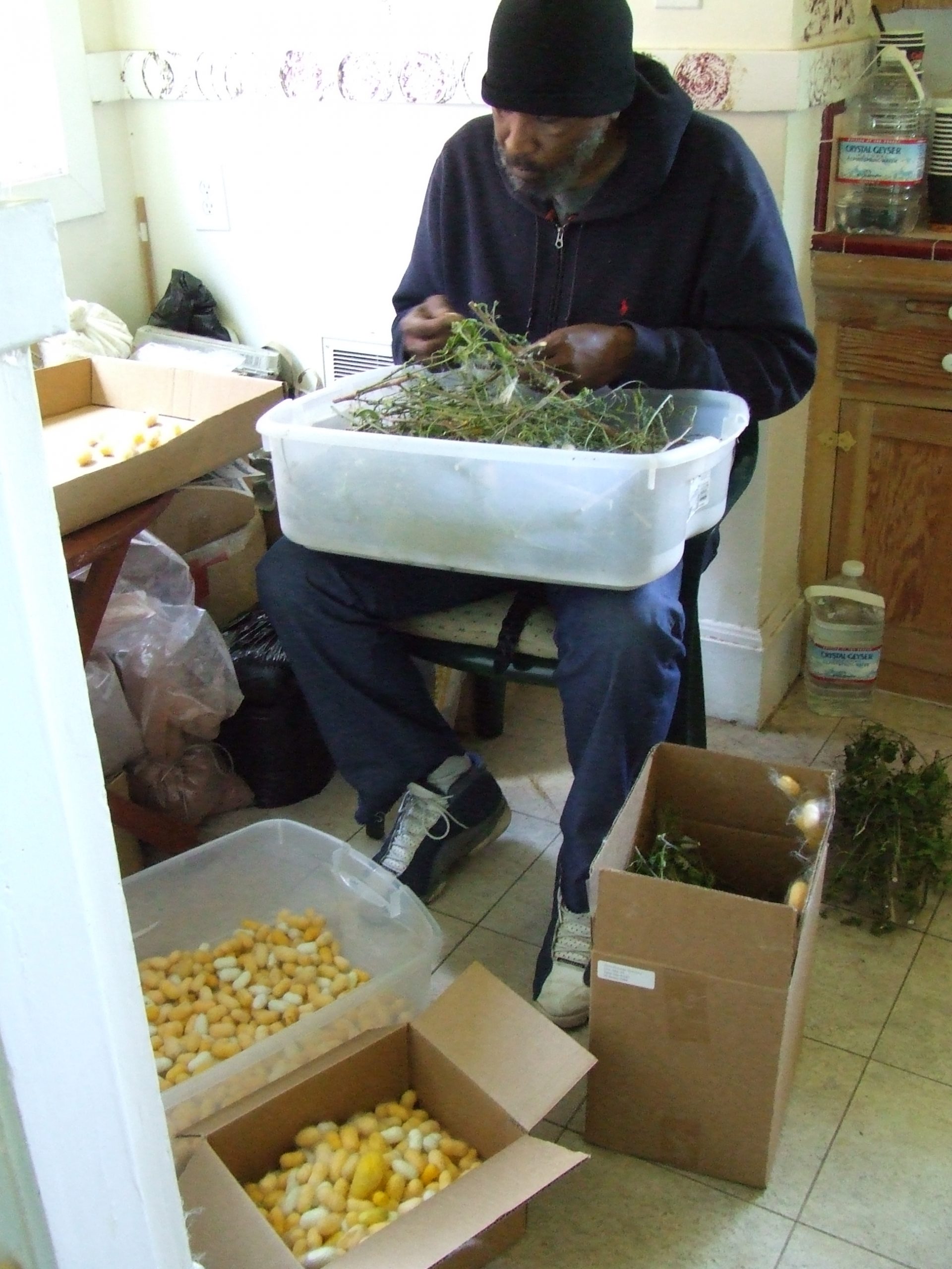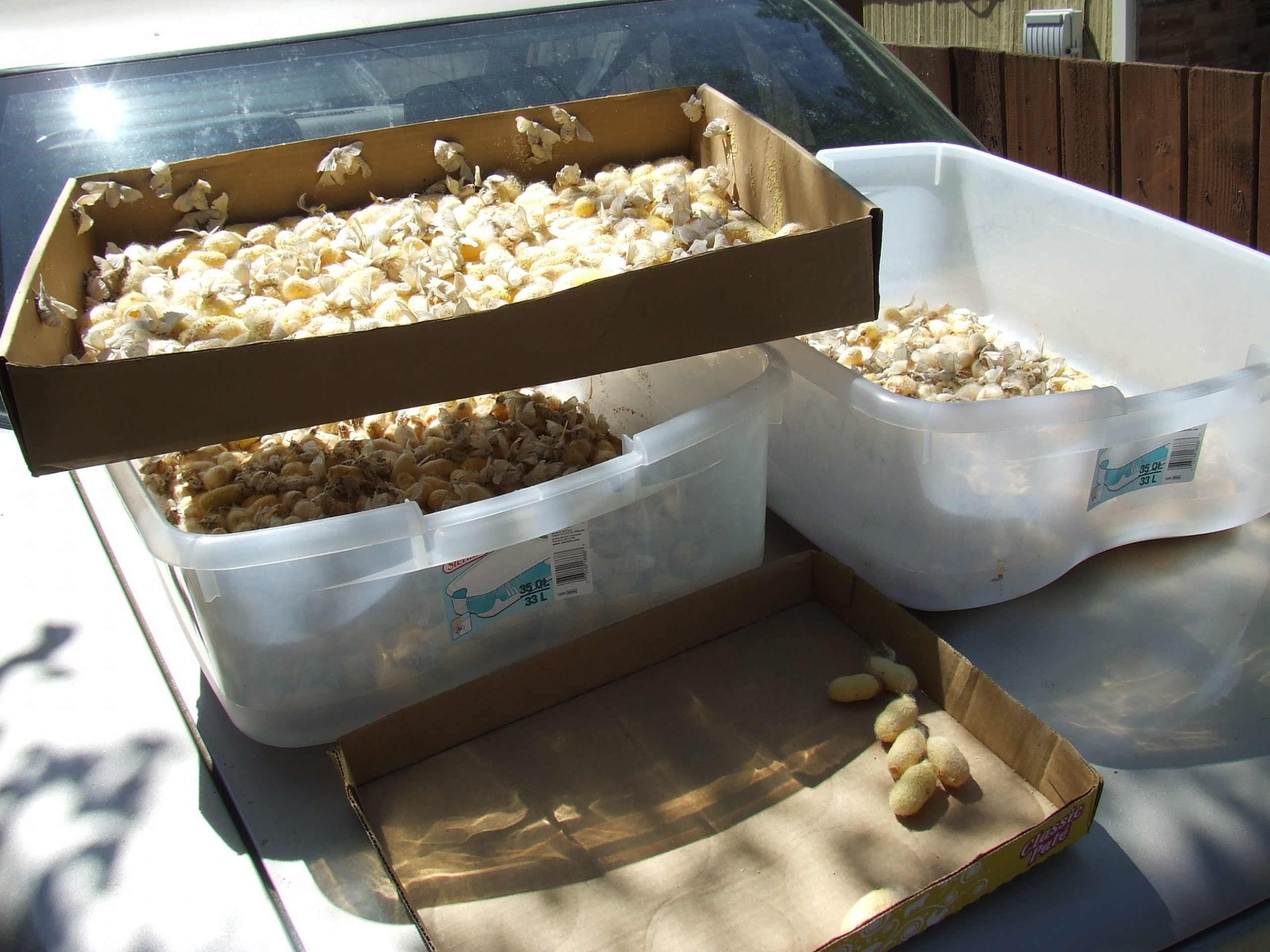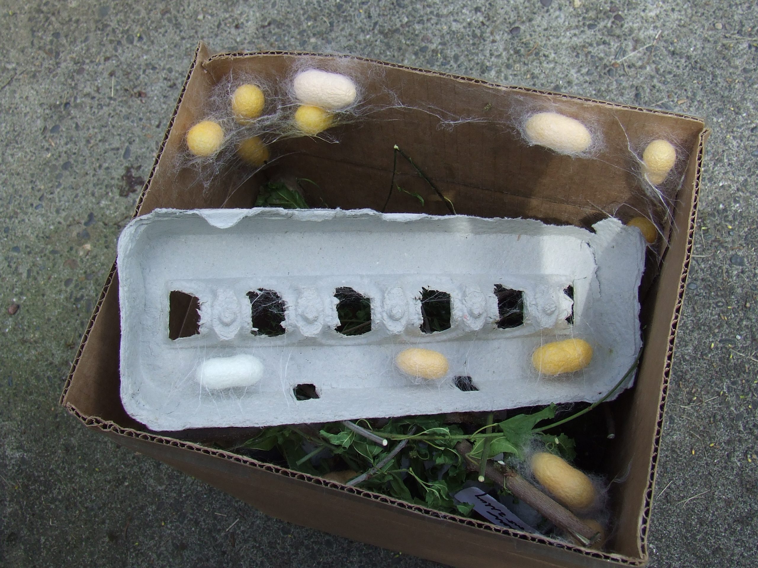 Add small branches or egg cartons for spinning supports once they are ready to spin, at about 4”. Three days after the last has begun to spin, the cocoons can be collected, cleaned and lain in fresh clean trays to await the emergence of the moths.